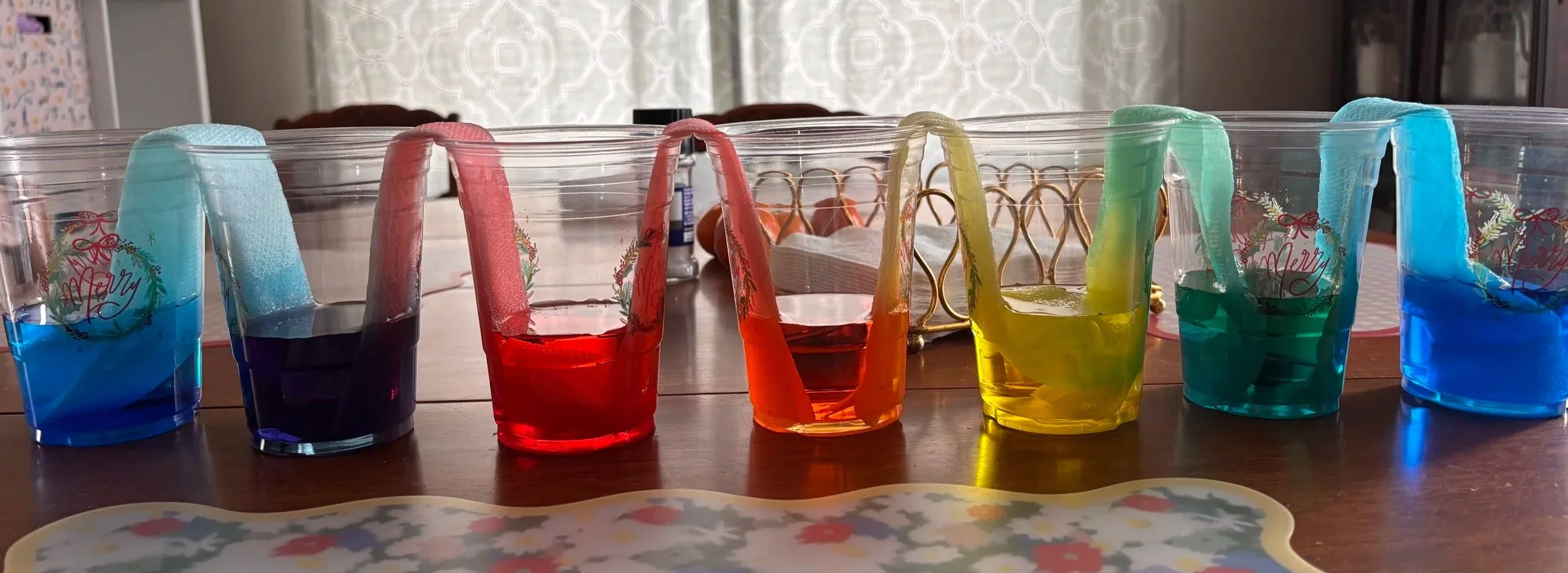 The experiment is simple enough. Four cups of water with red, yellow, and blue food coloring. Three empty cups between them. All connected by folded paper towels. We let it sit and came back about half an hour later to see what happened.